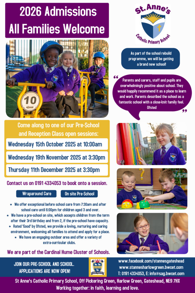 This admissions policy has been formally adopted by the governing body of St Anne’s Catholic Primary School, Gateshead. The governing body is the Admissions Authority and is responsible for determining the school’s admissions arrangements.